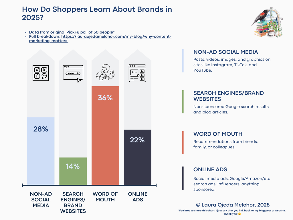 Content marketing helps people discover, trust, and connect with your brand. It provides value through blogs, social media, and videos, which many shoppers will search for after seeing an ad for your brand. The PickFu poll showed 42% of shoppers rely on organic content marketing to find new brands.